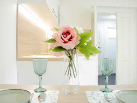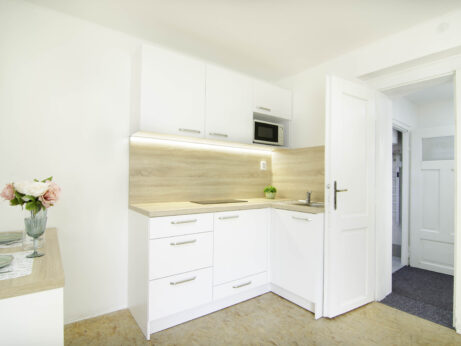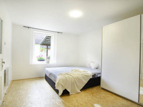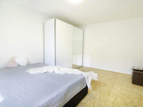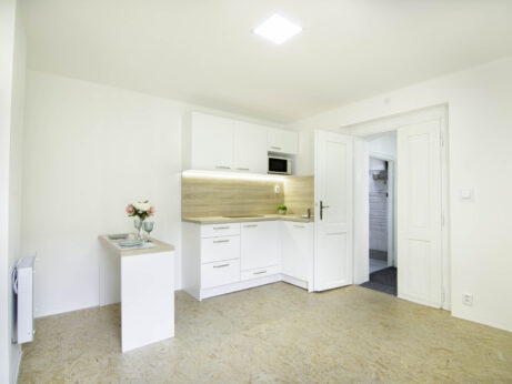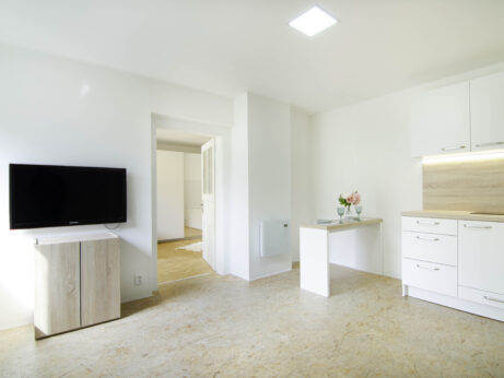 Byt má okna do zahrady a je pronajímán s novou kuchyňskou linkou včetně varné desky a flexibilního jídelního pultu, v ložnici bude k využití manželská postel a skříň, v obývacím pokoji bude mít nájemník k dispozici televizi. Vytápění je řešeno novými úspornými a plně ovladatelnými konvektory (el. přímotopy), ohřev vody zajišťuje nový elektrický bojler.