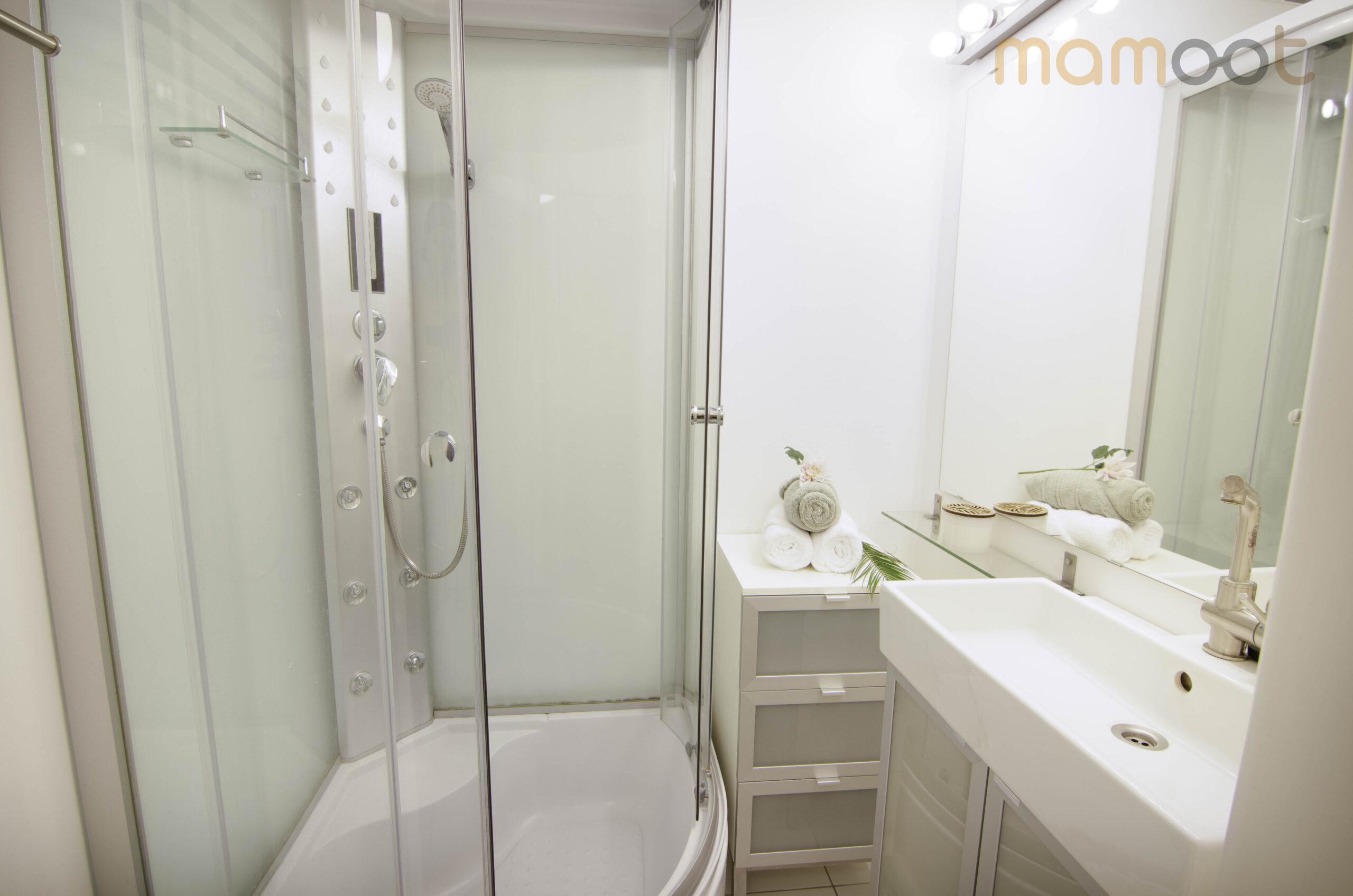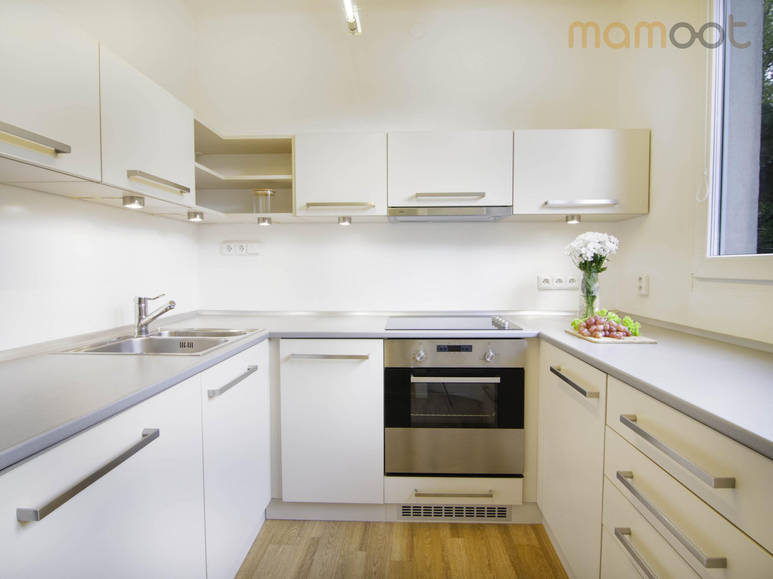 Byt je pronajímán částečně vybavený (nepotřebné vybavení je možno po dohodě odebrat). V kuchyni najdete moderní linku na míru s vestavnou troubou, varnou deskou, digestoří, lednicí, vestavnou myčkou i pračkou. Nechybí ani samostatná spíž s množstvím polic. Obývací pokoj je vybaven kvalitní televizní stěnou na míru, vestavnou skříní, pohovkou a jídelním stolem s židlemi, ložnice nabízí postelový rošt bez matrace, dva noční stolky, skříň a dvě komody. Okna mají žaluzie. Vytápění i ohřev vody jsou centrální (dálkové), radiátory mají poměrové měřáky tepla. Podlahy tvoří kombinace dřevěných parket, PVC a koberce.