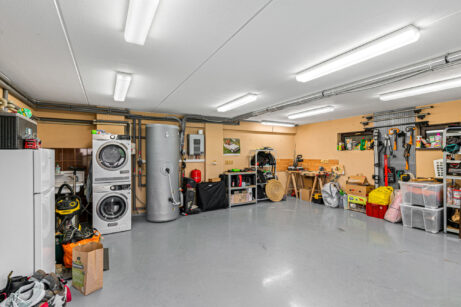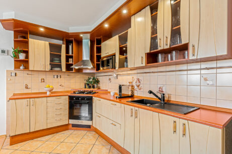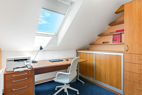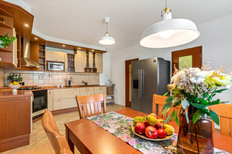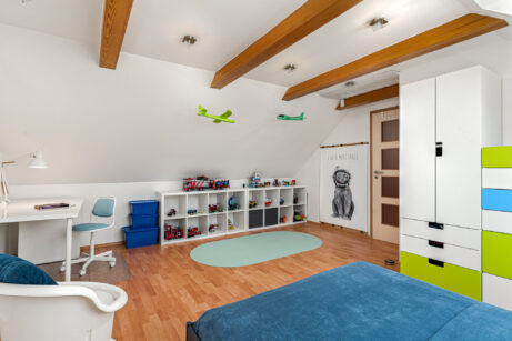 Dispozičně je 5+1, k tomu jsou další dvě místnosti na šatnu či pracovnu, v každém patře je koupelna a samostatné WC, má obrovskou technickou místnost - i pro jedno auto, garáž na dvě auta, sklep, kryté parkovací stání a dřevník - celkem užitná plocha 256 m2 - dostatek prostoru pro velkou rodinu.
