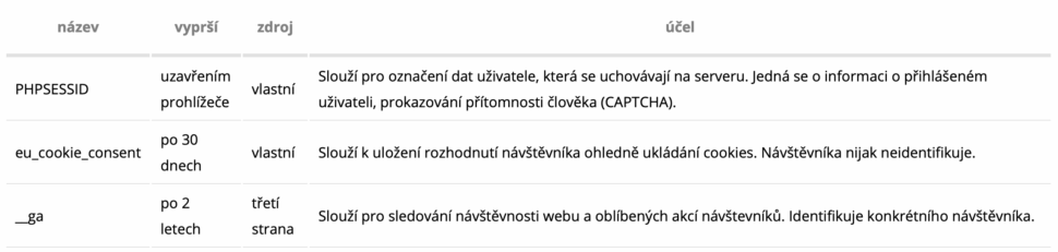 Na našich stránkách pracujeme se třemi typy cookies podle jejich účelu. K tomu, abychom využívali nezbytné cookies není potřeba vašeho souhlasu, jelikož tento typ cookies naše stránky potřebují ke správnému fungování. K analytickým nebo marketingovým cookies váš souhlas naopak potřebujeme. Pokud nám souhlas s ukládáním dáte, můžete jej na této stránce kdykoliv odmítnout.